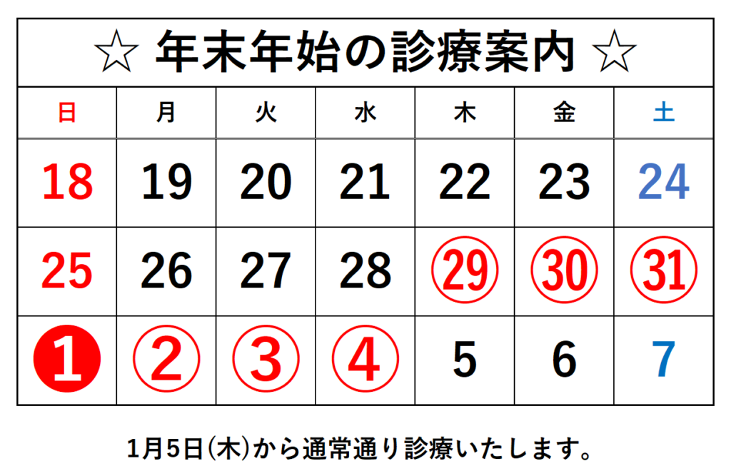 2022.12.05 新着情報 【年末年始のお休みのご案内】 木村歯科医院では下記のように年末年始のお休みをいただきます。 12月28日(水)午前のみ休診・午後から診療いたします。 12月29日(木)大掃除のため休診しますが、急患の方は午前中のみ随時受け付けます。 12月30日(金)~1月4日(水)まで休診します。 1月 5日(木)から通常通り診療します。