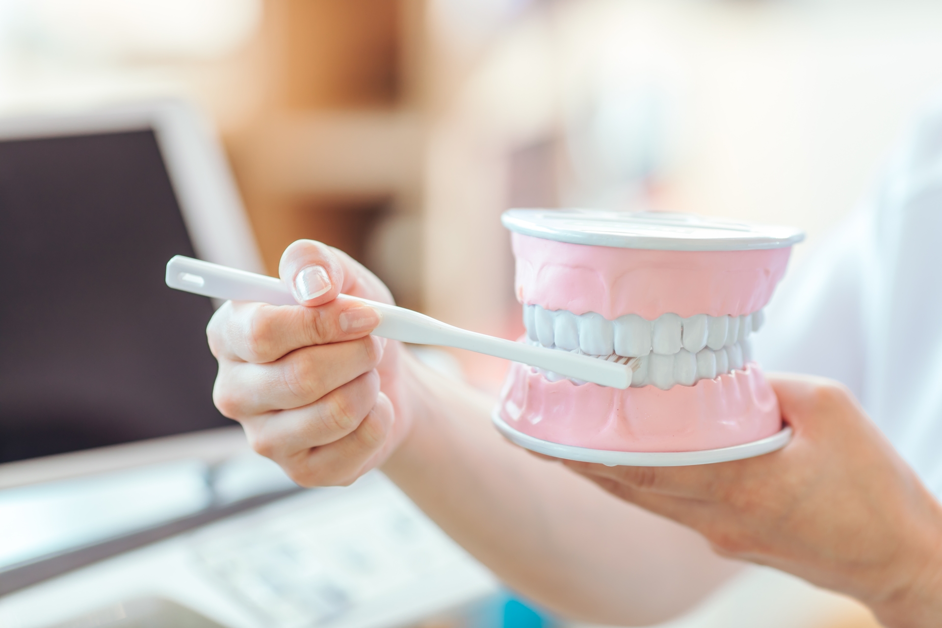 ブラッシング指導では、プラークコントロール(歯垢の付着を制御すること)を目的に、歯ブラシ・歯間ブラシ・デンタルフロスなどの清掃用具を正しく使えるよう丁寧にご説明いたします。